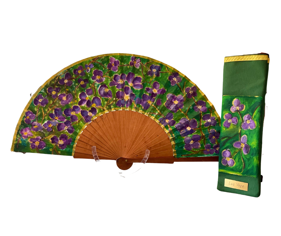 Añade un toque de naturaleza y arte a tu estilo con nuestro abanico de madera de peral, pintado a mano con técnicas de óleo y acrílico. Este diseño único presenta un delicado motivo floral en tonos púrpuras y verdes, evocando la serenidad de un jardín lleno de vida.